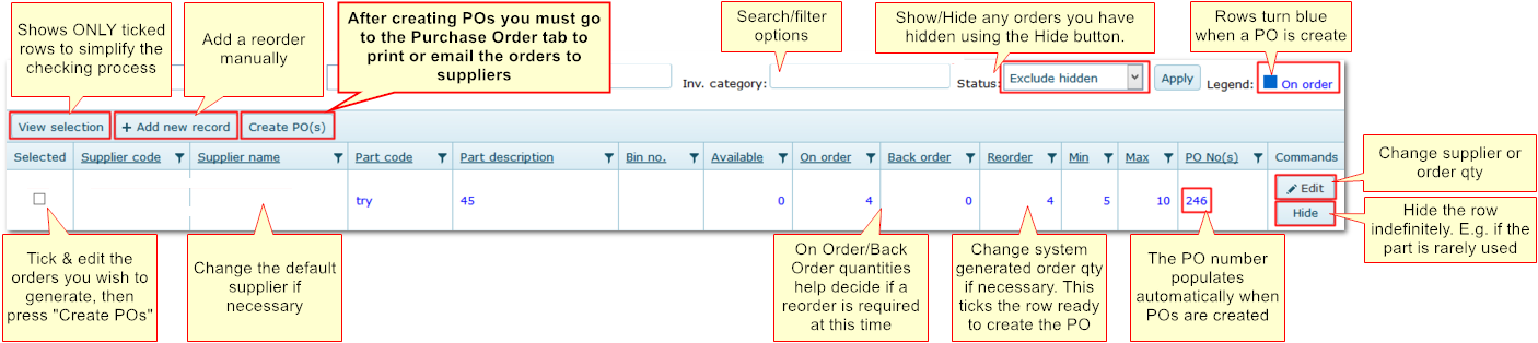 Click "Add New Record". The PO must be created at the time of entry, otherwise details will be lost when the reorder list is automatically refreshed.
