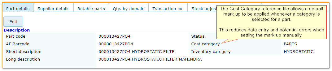 Enter the mark up in the Cost section in the parts details screen, or use a default mark up attached to the Cost Category