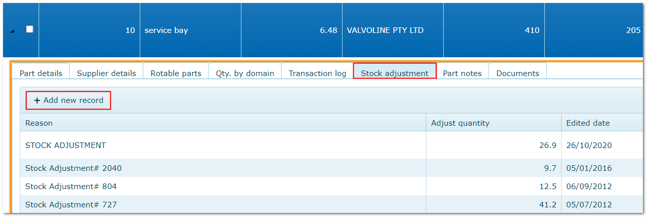 •The adjustment is recorded on the parts ledger and in the Transaction Log tab in the parts details