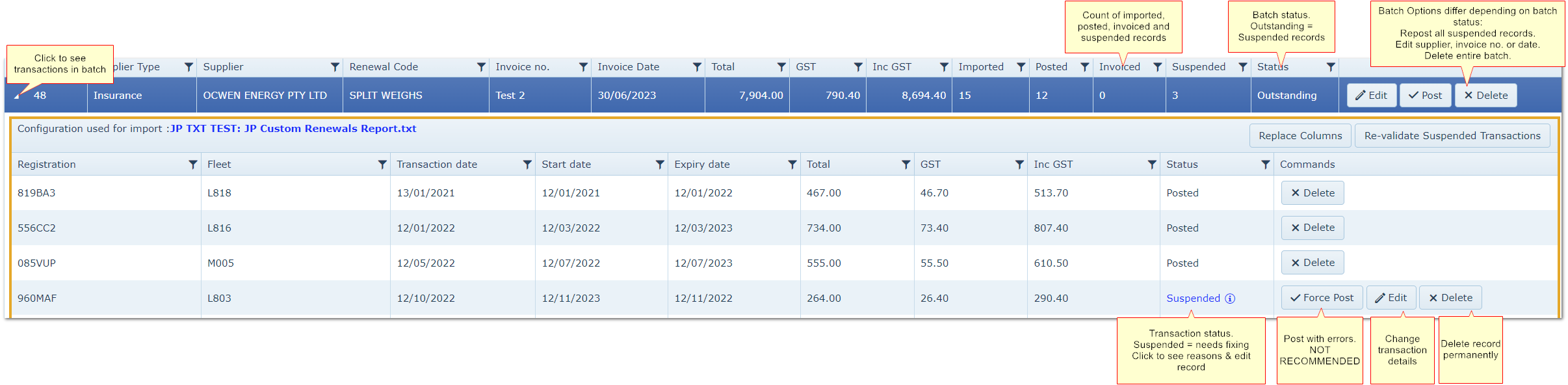 9.The new batch appears main the main screen ready for any suspended records to be checked and amended (see point 2 below)