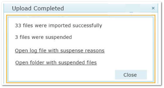On completion of validations, a results screen is presented with a link to a log file with failure reasons.