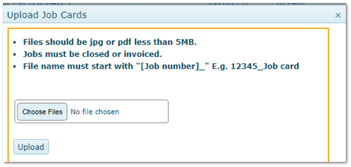 •The file name as per upload (E.g. 12345_job card.jpg)