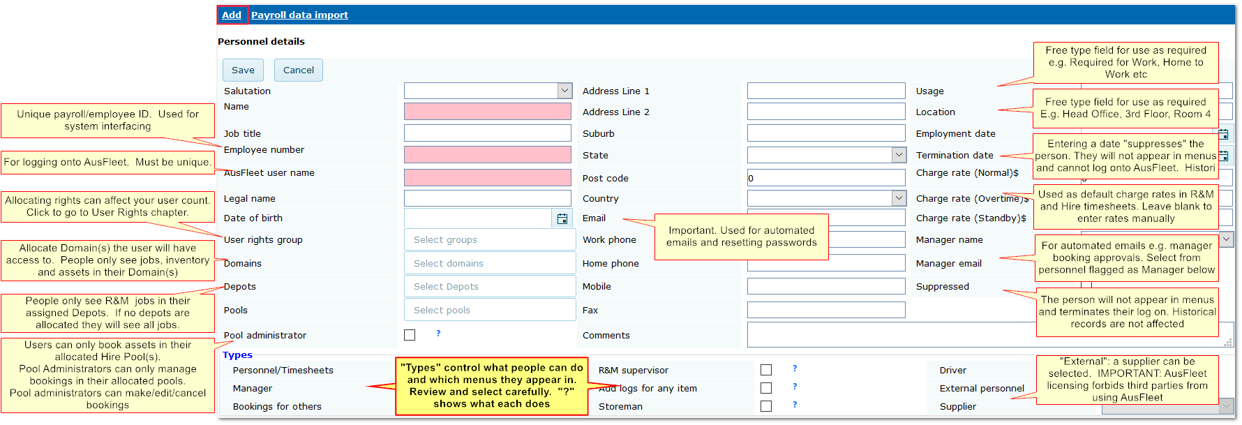 •Personnel cost centre and debtor are used to invoice hire charges to the driver