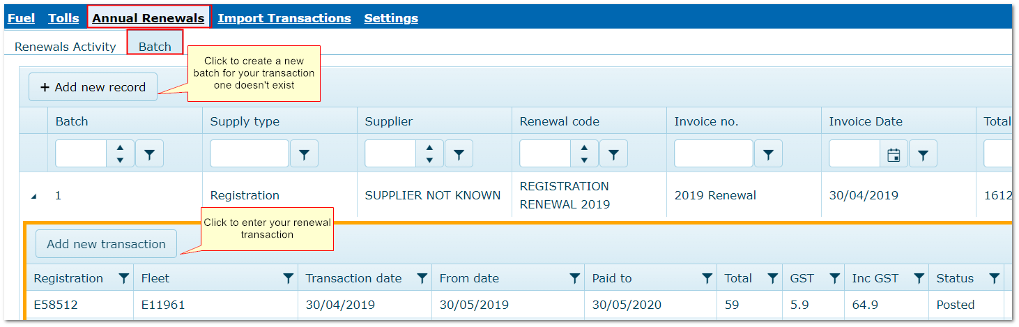 An alternative method for simple recording of start/end dates per fleet item is in Fleet>>Annual Renewals tab.
