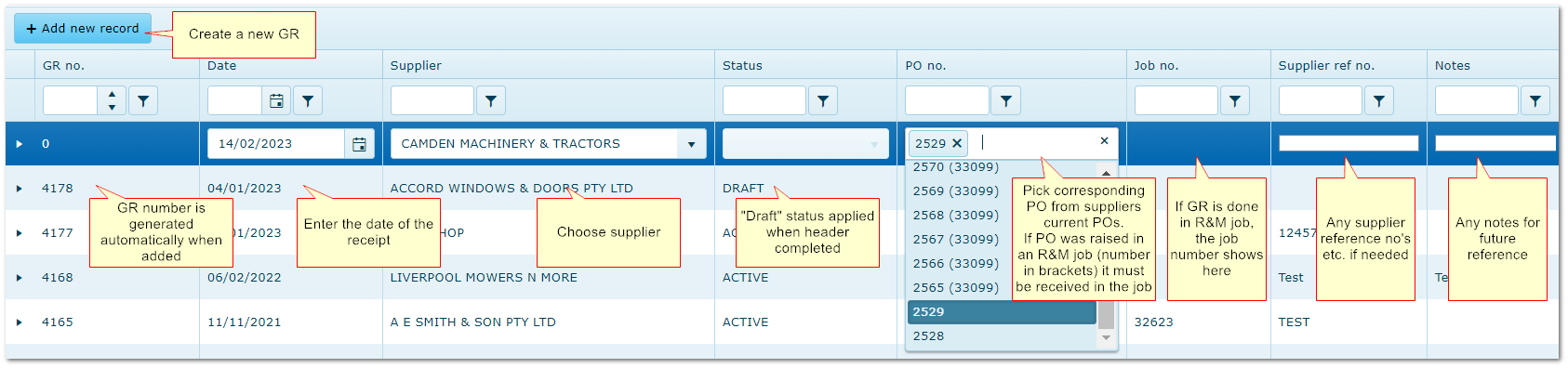 Click "Add new record" and enter header details. Only suppliers ticked as "Inventory" in the Supplier reference file can be selected.