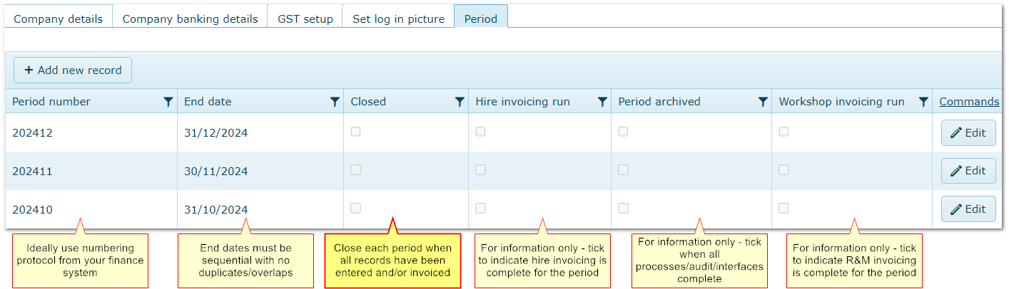 •When no more periods exist, AusFleet will crate a new one automatcially
