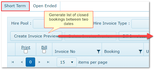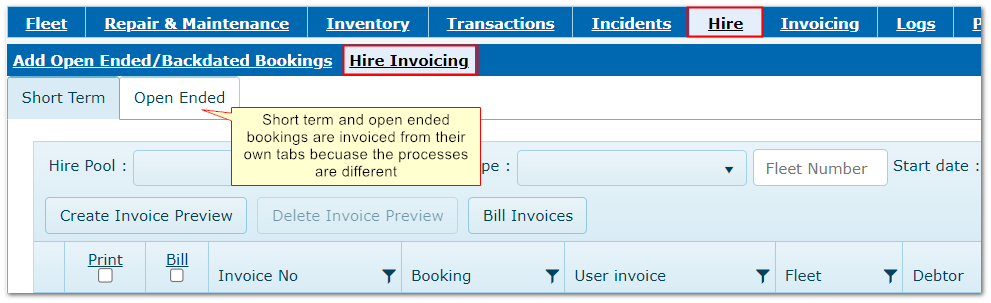 Short term and open ended bookings are invoiced in different tabs due to different processing requirements.
