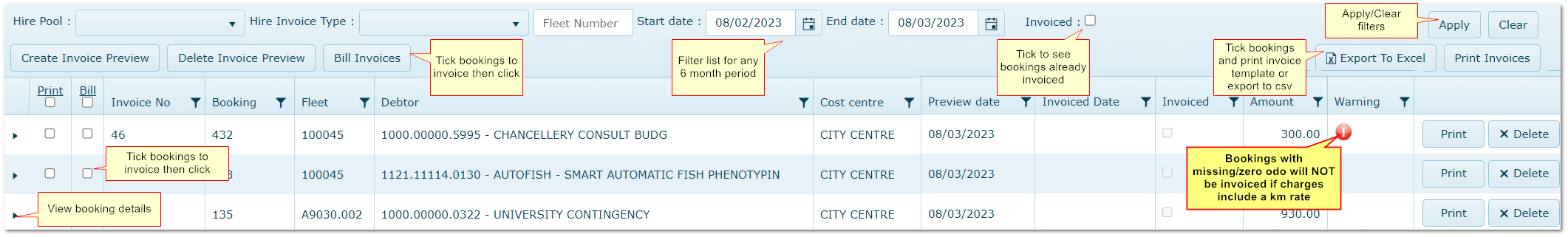 Deleting Preview: Use the Delete Invoice Preview button. This does not delete booking records, just the current view, which can then be regenerated as required.