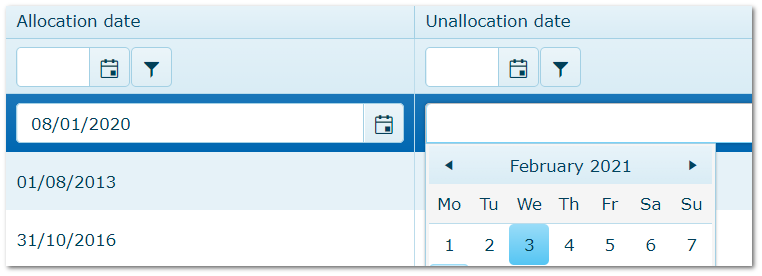 Locate the asset, click Edit and enter an Allocation or Unallocation date.