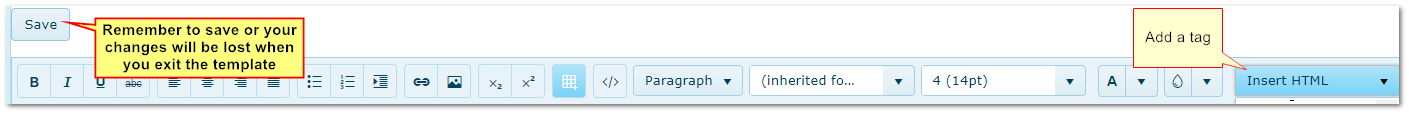 To use tags, place the cursor at the required position and then select the required tag from the "Insert HTML" menu on the toolbar.