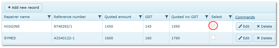 •In the "Quote/Repairer" tab enter any repair quotation(s)