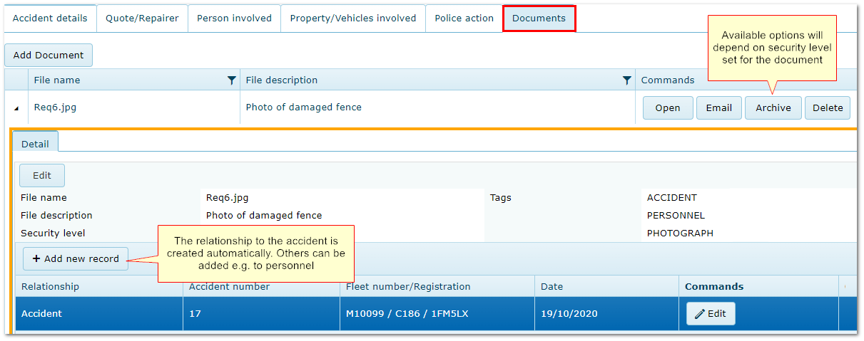 A relationship to the accident and fleet number is created automatically and the document can be accessed from the Accidents or Documents module.