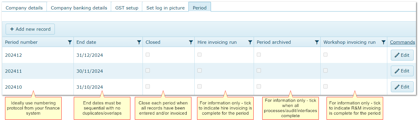 The list must be kept up to date with current and future periods if invoicing/accruals are required - periods can be created in advance