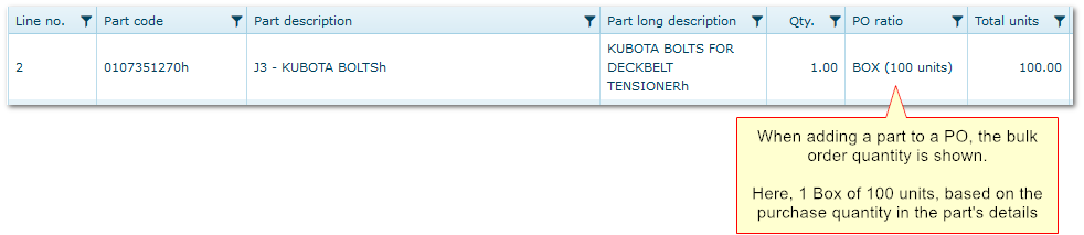 Use for parts ordered in multiples/bulk quantities e.g. drums, pallets, boxes, to maintain correct order/issue quantities/price.