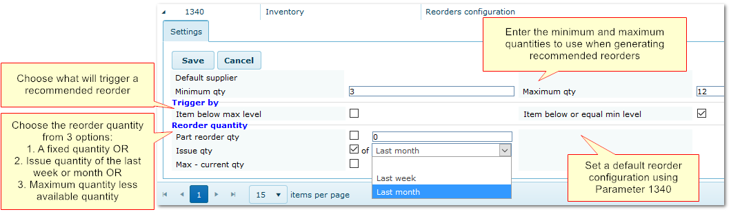 This sets the default trigger and order quantity for recommended reorders (Inventory>>Orders/Receipts>>Reorders)