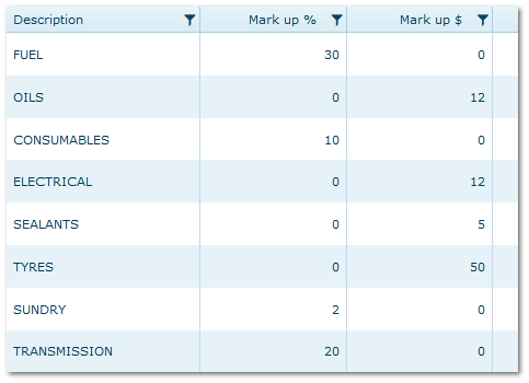 •Default mark-up in either % or $ but not both - mark ups are applied to the current cost price for each part