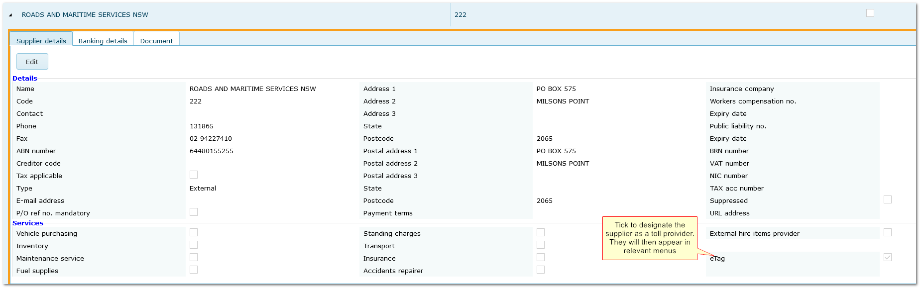 Create the Supplier and tick the "eTag" flag as shown below.
