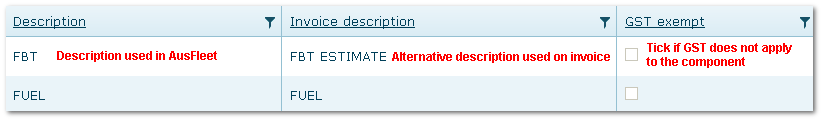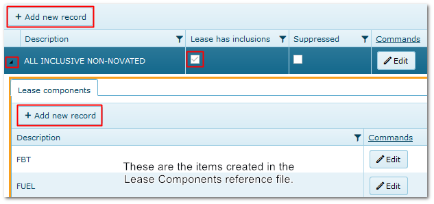 Enter the components you want to itemise in the lease details e.g. fuel, servicing, registration, tyres, admin fee, lease fee, FBT, management fee.