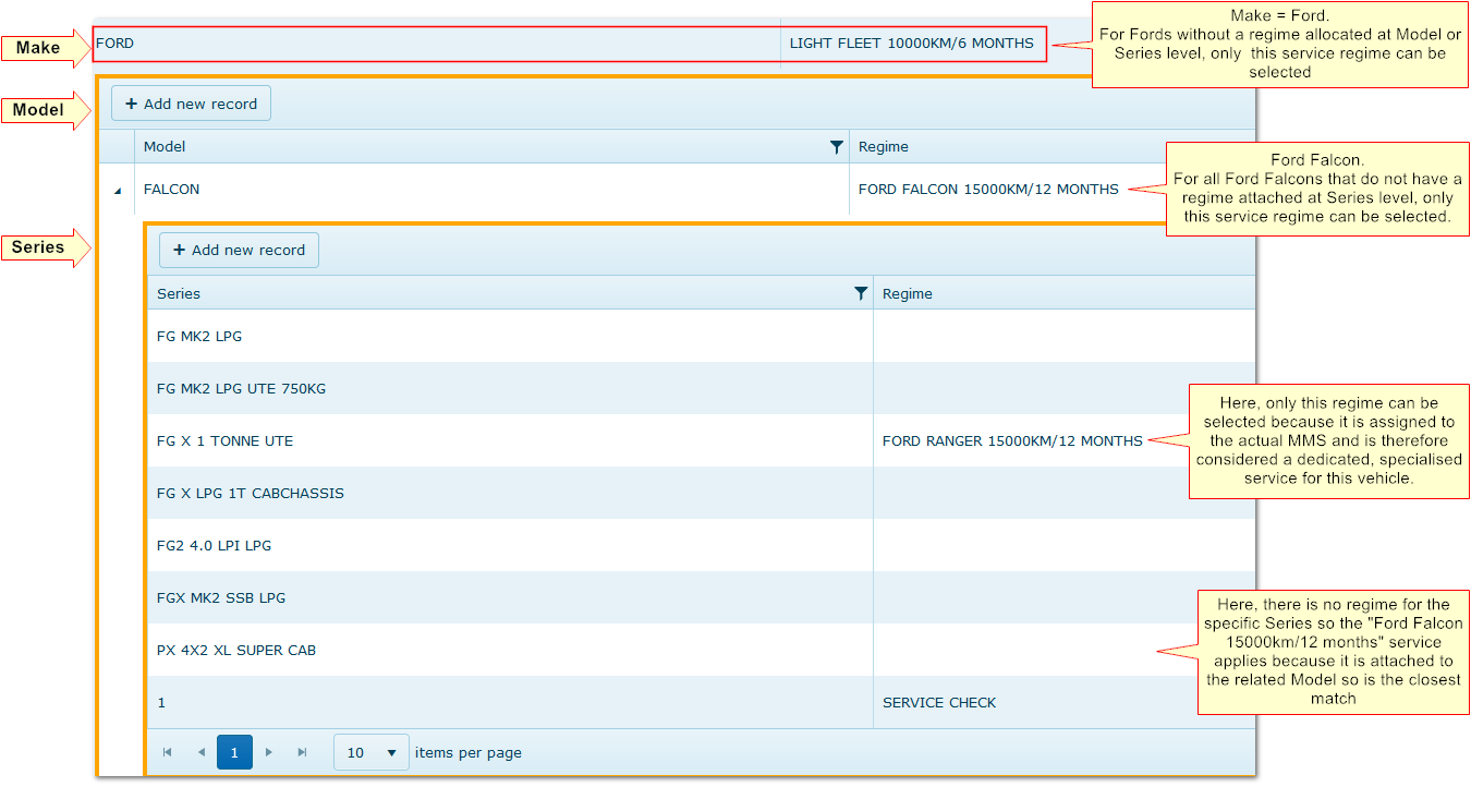 If there is another model e.g. Focus, attached to Ford without any other regimes to Focus or series level, then all Ford Focus' would use the "Light Fleet 10000km/6 months" regime.