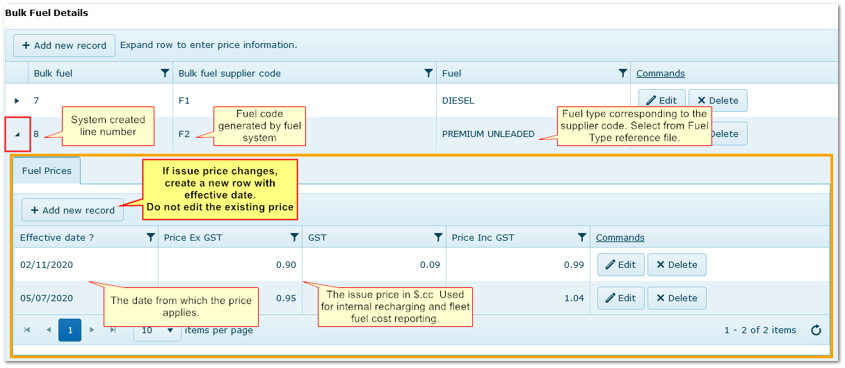 When adding fuel types for bulk suppliers, open each row and enter fuel price information.