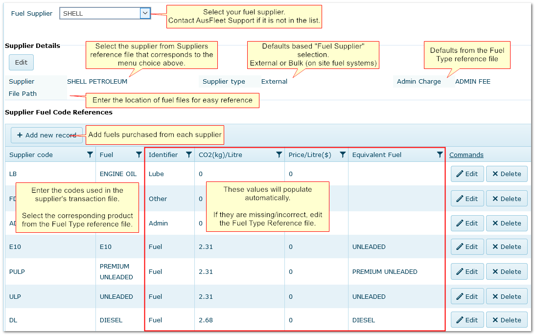 •Add fuel types used for each supplier, plus an Administration code (to process admin fees)