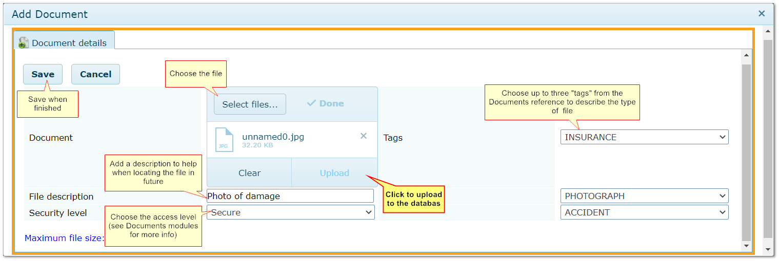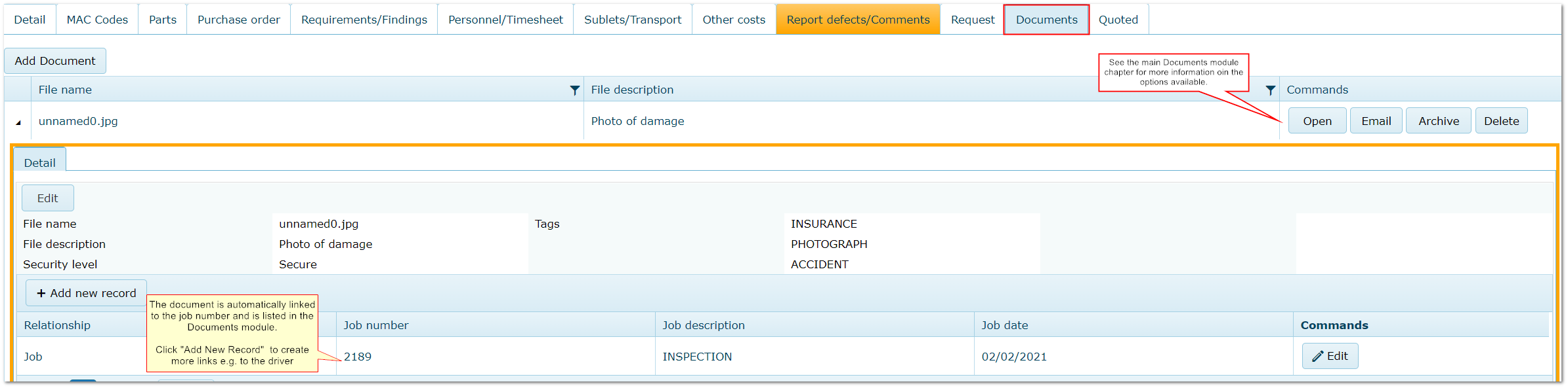 Documents related to the job may be uploaded to the database here. They are automatically linked to the job number.