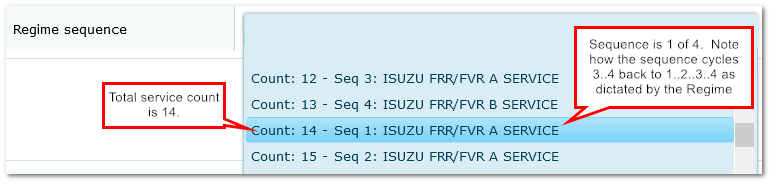 Under normal circumstances the system will choose the correct service based on the last closed service job but if you wish to change the service (for example to skip a service) you can do so. The regime sequence menu shows the forward sequence you can choose from.