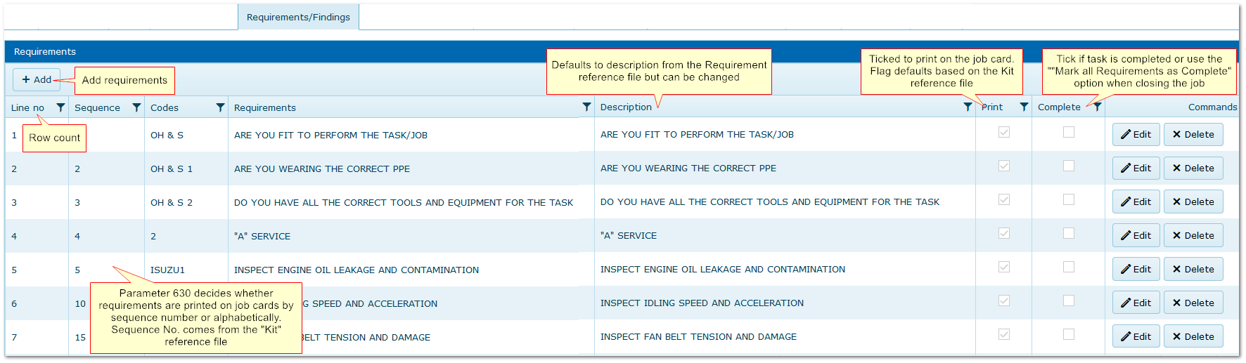 Requirements can also be added manually in this tab. They are printed on the job card if the Print flag is ticked.