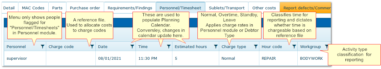 Timesheets can be added manually as required in this tab or using the "Timesheets" link on the R&M module menu. This method is easier when adding multiple timesheets per person.