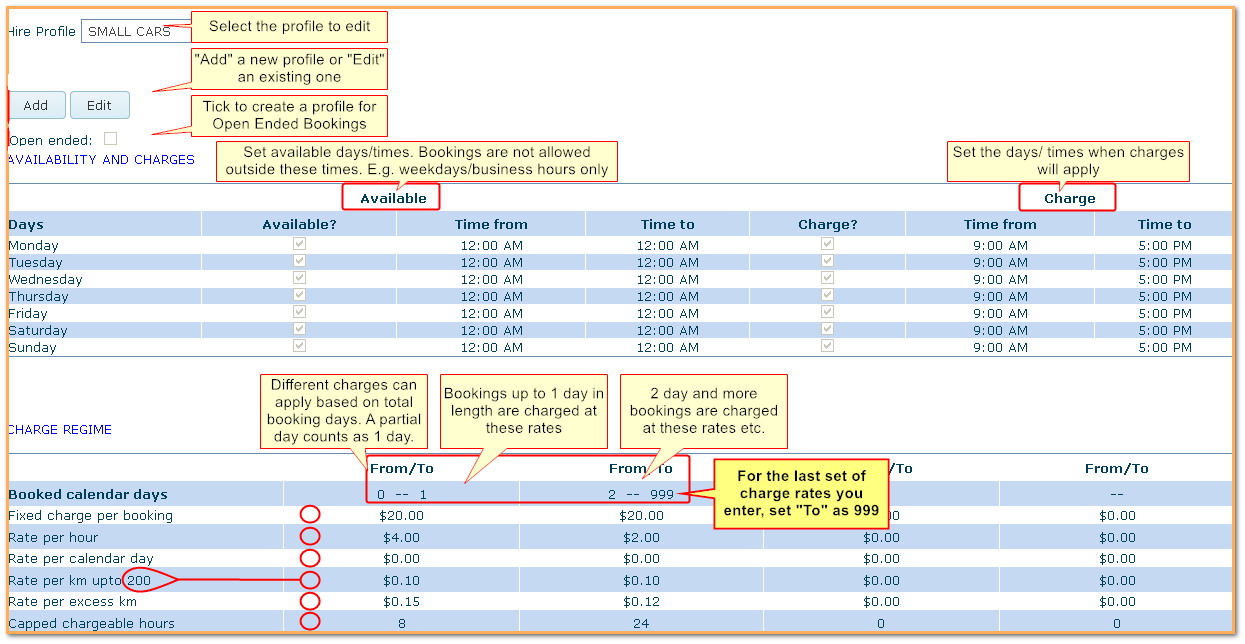 Charges are controlled using "Hire Profiles" which include a charge regime and availability times.
