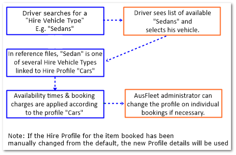 Drivers search for the Hire Vehicle Type they need E.g. Minibus. When they book the actual vehicle, the charges in the related Hire Profile are applied.