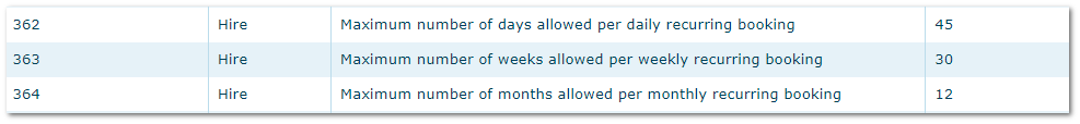 These contain the times/days that assets are available for hire and the charges that apply to bookings.