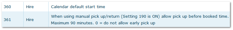361: Of particular importance to Key Cabinet users. Sets the number of minutes that vehicles can be collected prior to booked time.