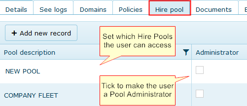 •Pool Administrator: Gives access to administrator functions for assigned Hire Pools