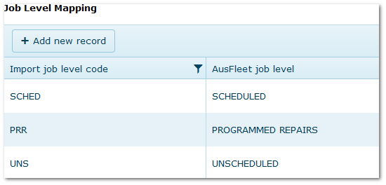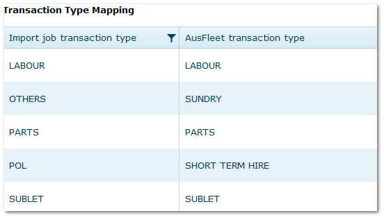 The set up requires the codes used in the supplier's data file to be mapped to Job Classes, Job Levels and Transaction Types in AusFleet.