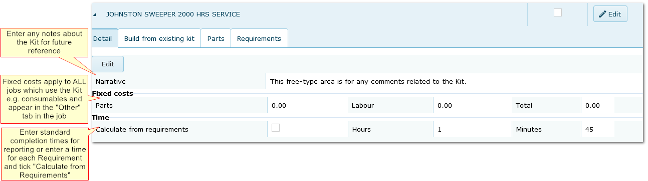This level of detail is time consuming to set up and entering a standard flat rate time against the Kit is more usual.