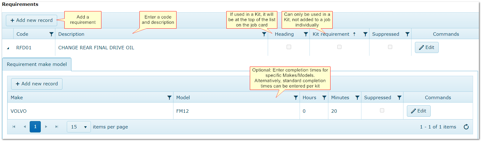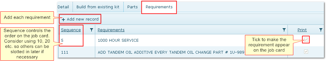 Enter details as shown to create a list of requirements that can be used to create Kits or added individually to jobs..