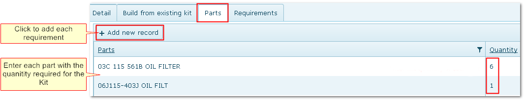 Enter details as shown to create a list of parts that can be used to create Kits or added individually to jobs..