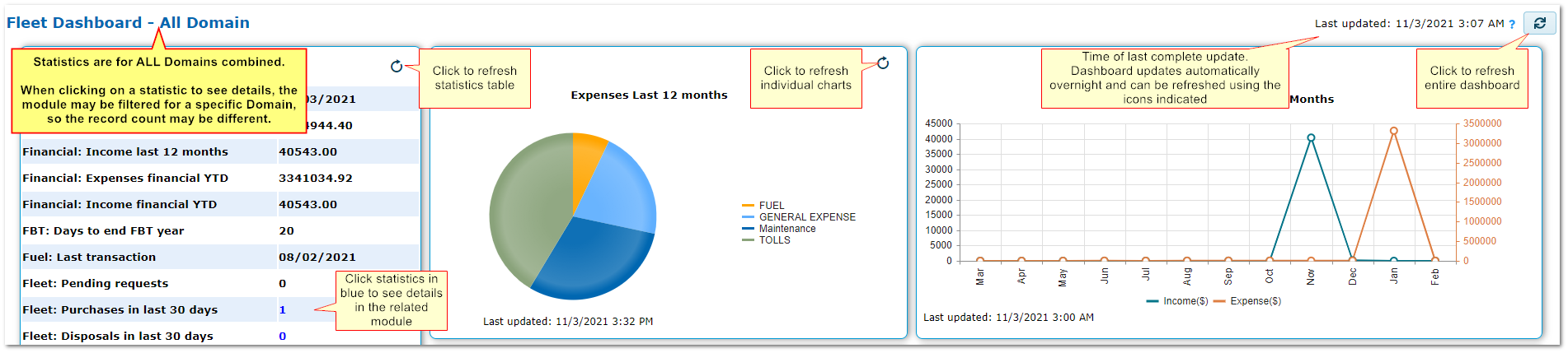 Individual details or the entire dashboard can be refreshed at any time using the refresh icons.