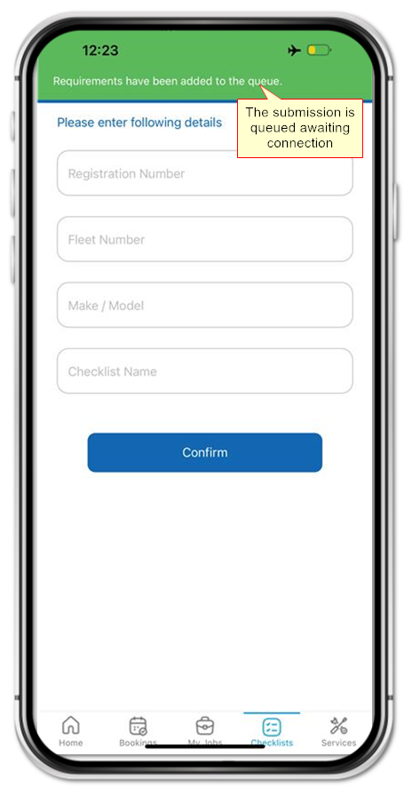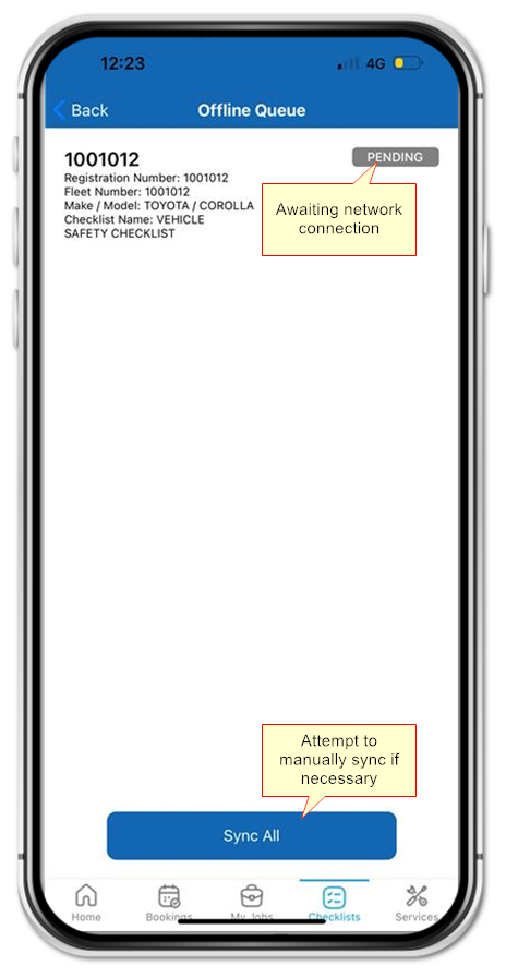 If you are offline when completing the checklist, results are queued pending network signal.