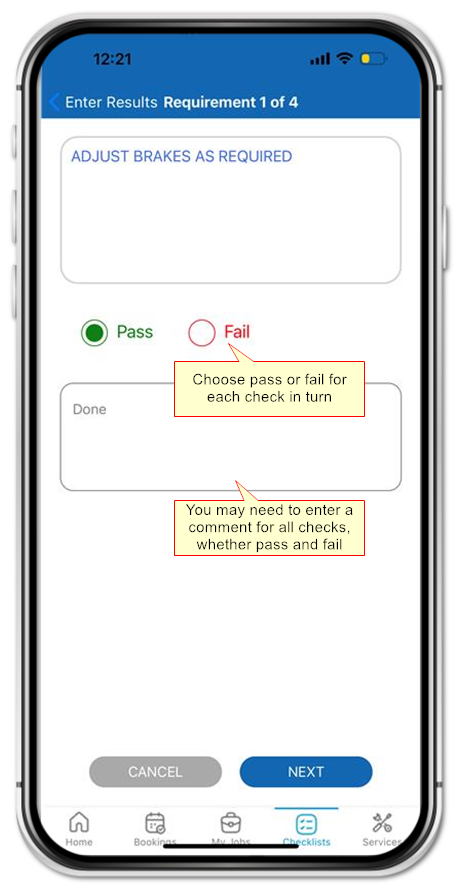 Carry out checks one by one, choosing Pass or Fail for each.