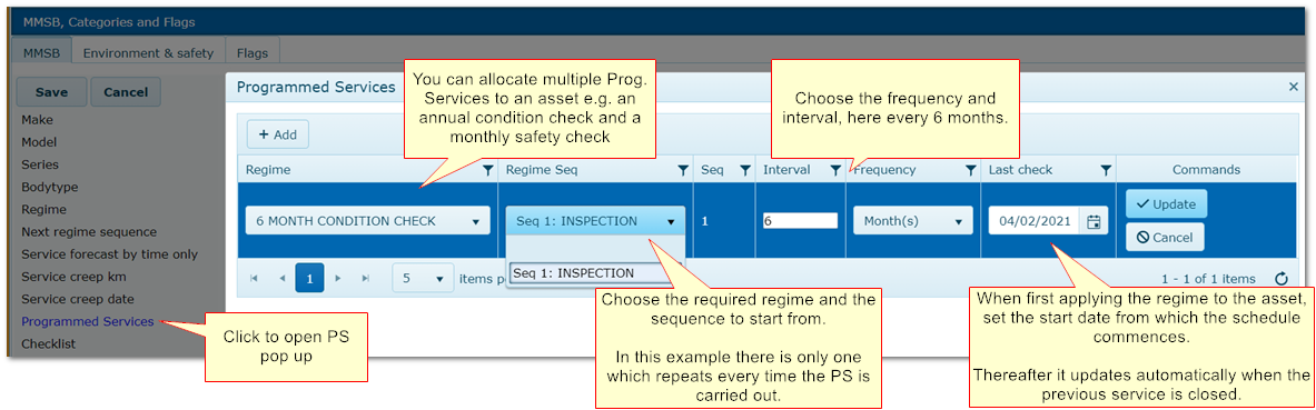 Allocating a PS to an asset in Fleet>>MMSB, Categories & Flags>>Programmed Services