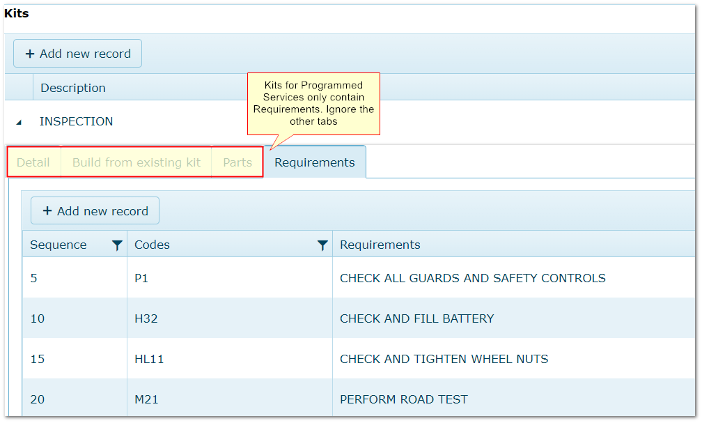 *If the requirements in the service are the same every time, as they might be for a condition or safety check, you will only need one kit that repeats every time.