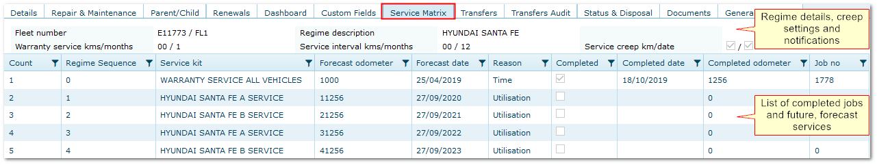 The Service Matrix tab in the Fleet module provides a record of services completed (or missed) and future schedule.