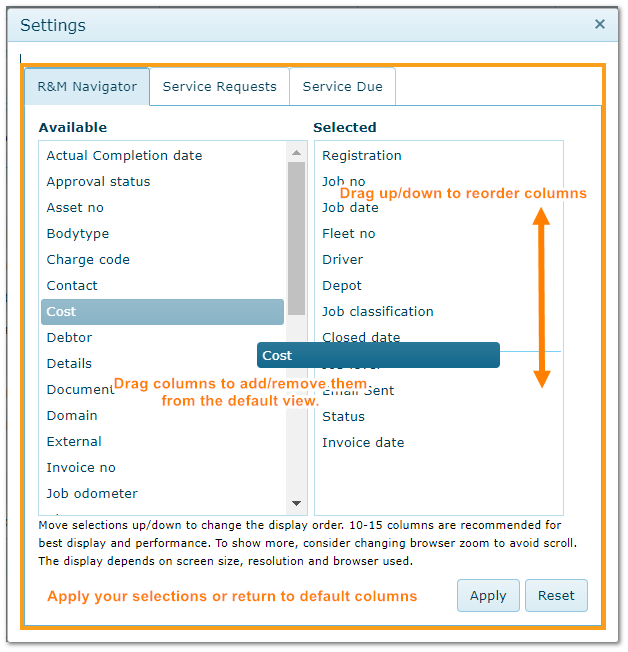 •Drag columns left/right to add/remove and up/down to order the columns selected