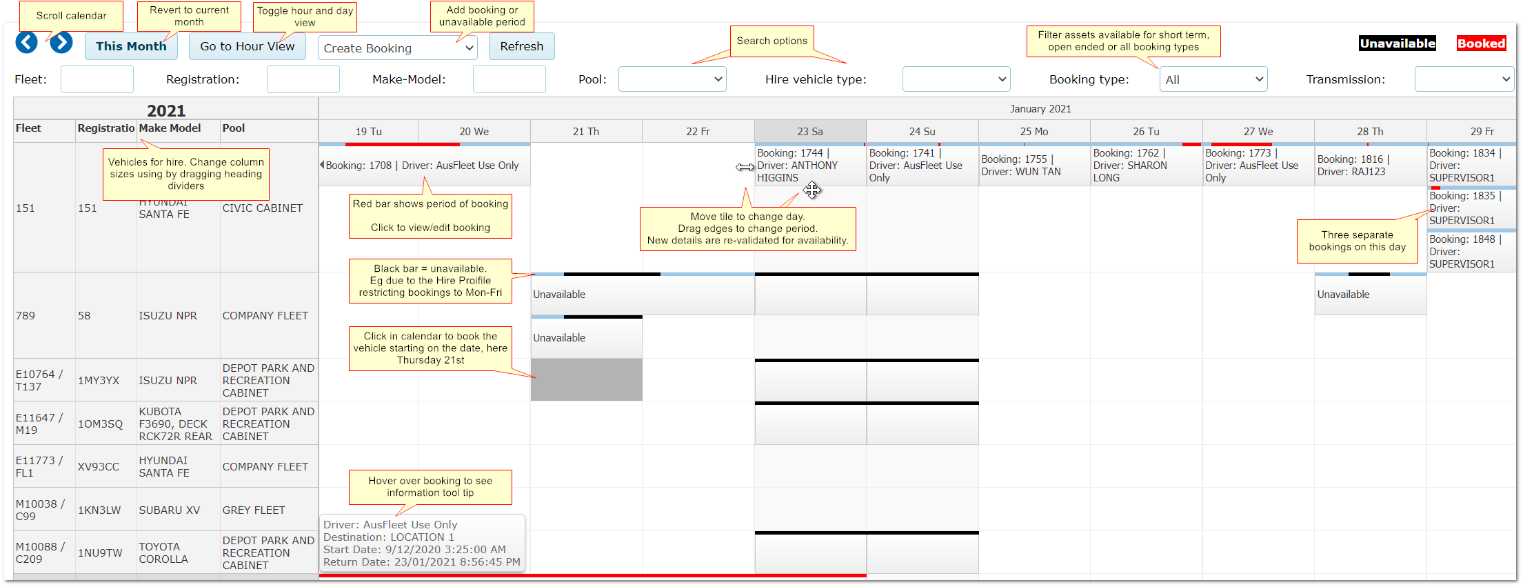 Use the filters at the top - fleet no., registration, make/model, hire vehicle type etc