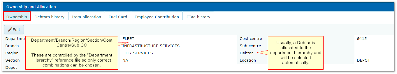 1. Viewing/Editing Ownership, Driver Allocation, Debtor, Location Details